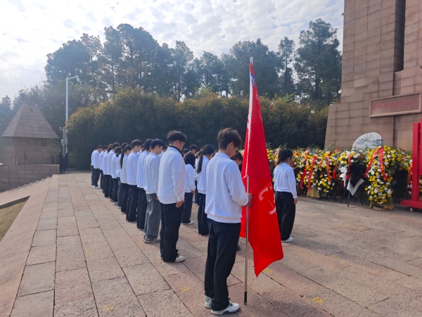 活动现场庄严肃穆,全体同学在革命烈士纪念碑前整齐列队,肃立默哀,深切缅怀为国家和人民英勇献身的革命先烈。随后,学生代表郑重向纪念碑敬献花篮,寄托对先烈的无限哀思与崇高敬意。
