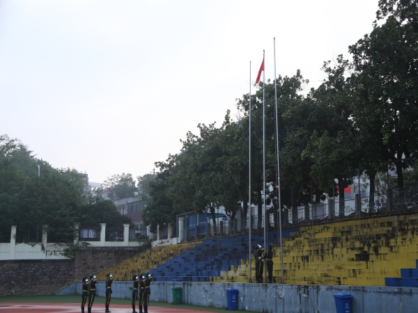 仪式在主持人的宣布中正式开始。晨光熹微中,国旗护卫队迈着铿锵有力的步伐,护卫国旗走向升旗台。伴随着雄壮的《义勇军进行曲》,五星红旗冉冉升起,迎风展开。全体师生肃立行注目礼,爱国情怀在静默中凝聚升华。