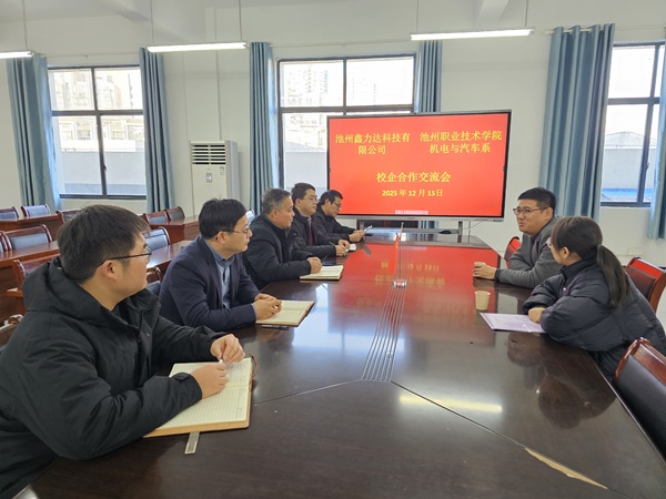12 月 15 日下午,池州鑫力达科技有限公司总经理张博一行来我系对接校企合作事宜。我系党总支书记周立新、系副主任吴志光、教务科长章毅、党务学工科长方令权、机电专业群副主任陈宏胜参与商谈。
